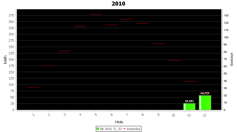 | Mois | Production(kWh) | kWh/kWp | Co2 (Kg) | Gains | % |