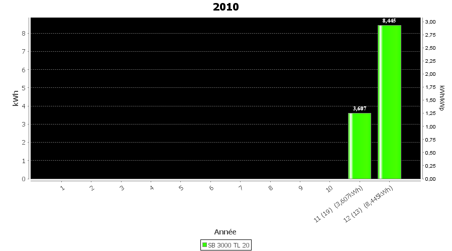| Onduleur | Wp | Initial | kWh/kWp | Production | kWh/kWp | % |