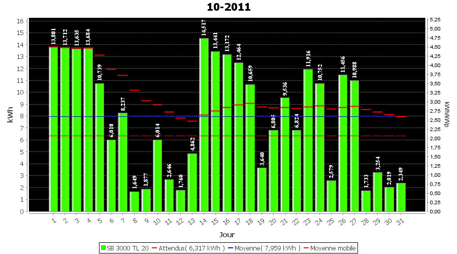 | Jour | | Production(kWh) | kWh/kWp | Co2 (Kg) | Gains | % |
