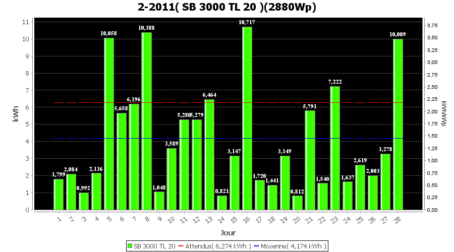 | Jour | | Production(kWh) | kWh/kWp | Co2 (Kg) | Gains | % |