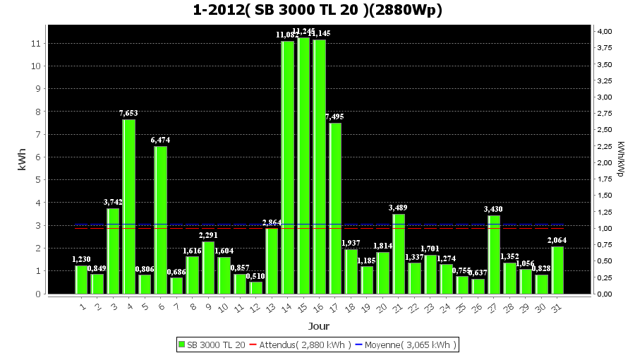 | Jour | | Production(kWh) | kWh/kWp | Co2 (Kg) | Gains | % |
