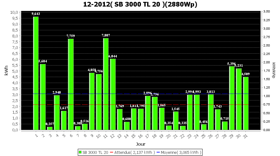 | Jour | | Production(kWh) | kWh/kWp | Co2 (Kg) | Gains | % |