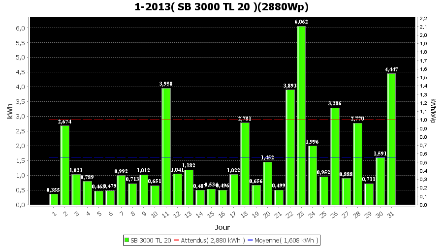 | Jour | | Production(kWh) | kWh/kWp | Co2 (Kg) | Gains | % |