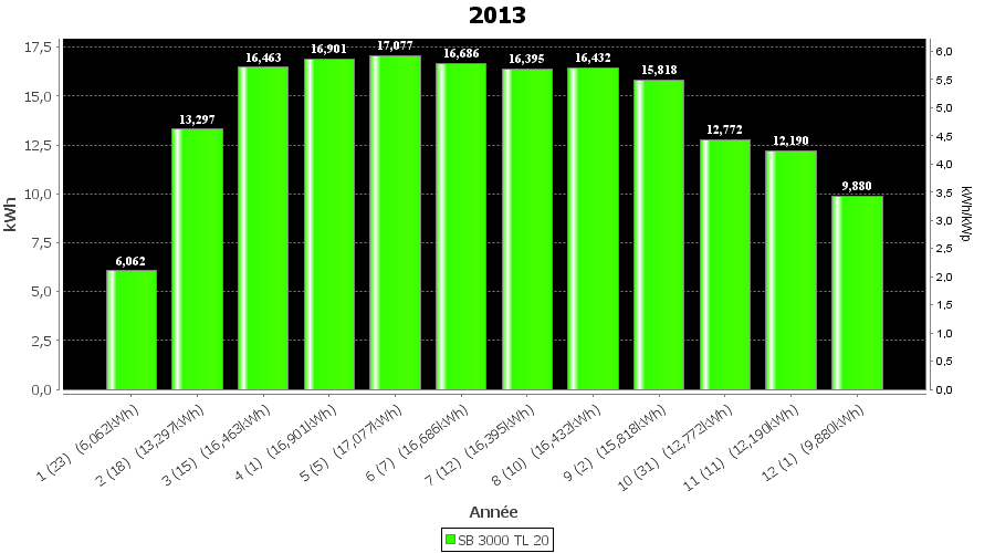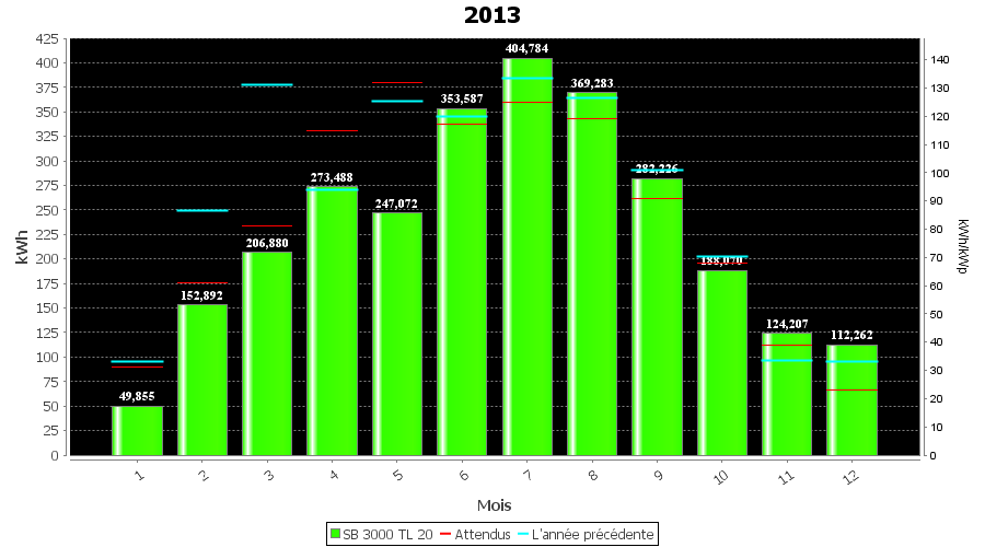 | Mois | Production(kWh) | kWh/kWp | Co2 (Kg) | Gains | % |