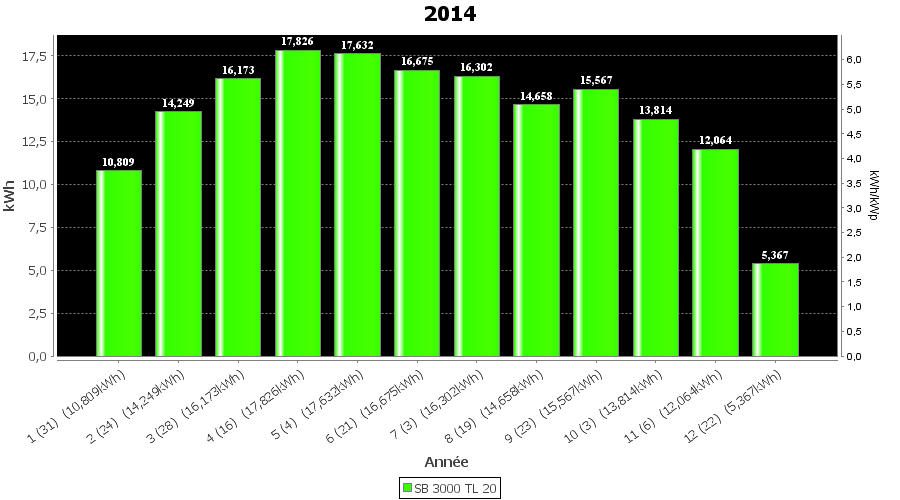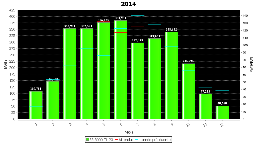 | Mois | Production(kWh) | kWh/kWp | Co2 (Kg) | Gains | % |
