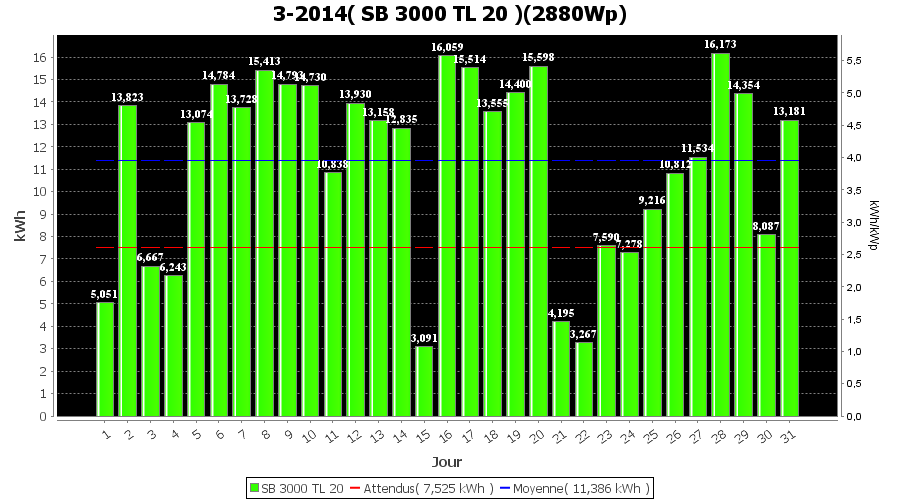 | Jour | | Production(kWh) | kWh/kWp | Co2 (Kg) | Gains | % |