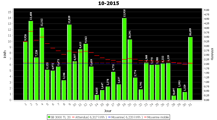 | Jour | | Production(kWh) | kWh/kWp | Co2 (Kg) | Gains | % |
