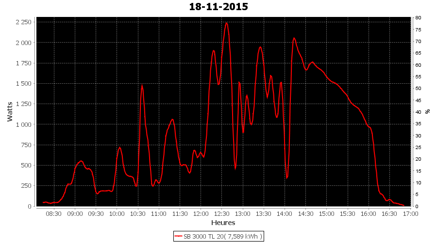 | Jour | | Production(kWh) | kWh/kWp | Co2 (Kg) | Gains | % |