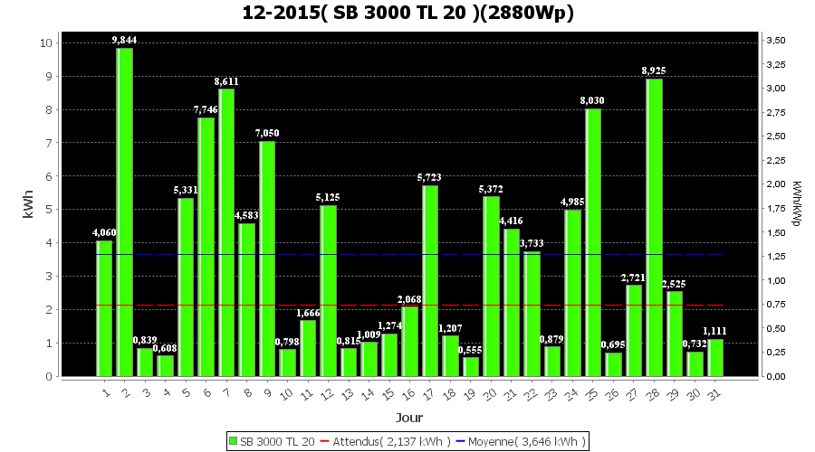 | Jour | | Production(kWh) | kWh/kWp | Co2 (Kg) | Gains | % |