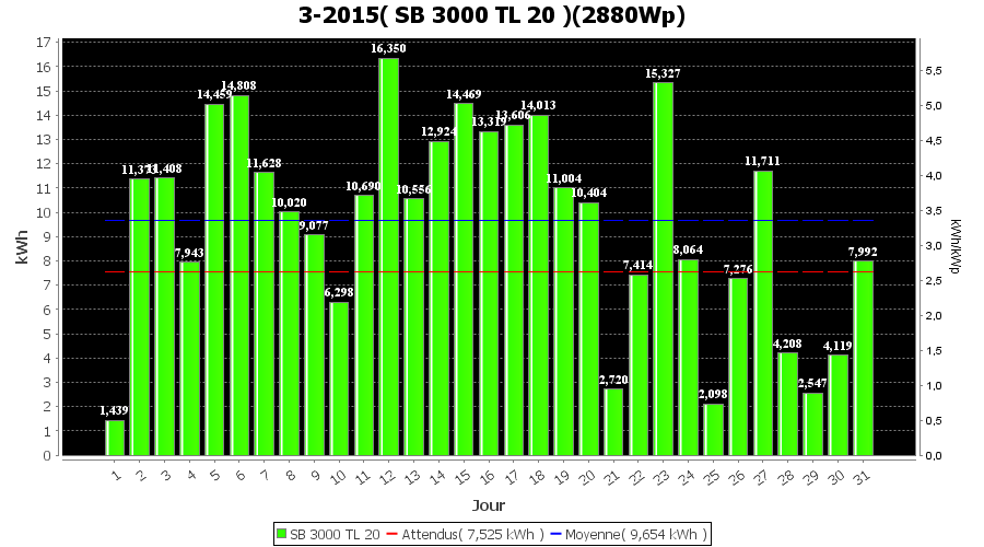 | Jour | | Production(kWh) | kWh/kWp | Co2 (Kg) | Gains | % |