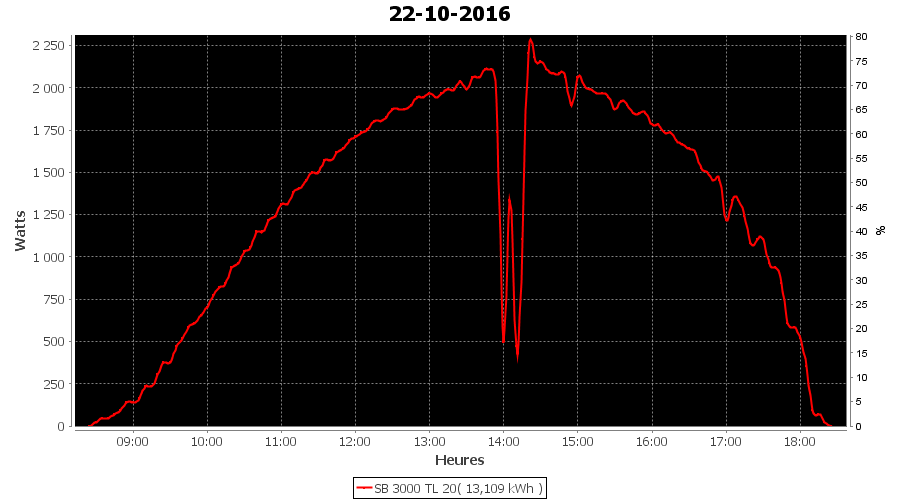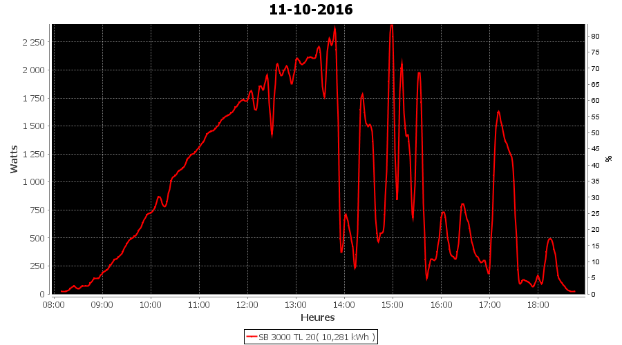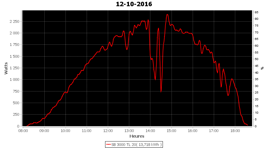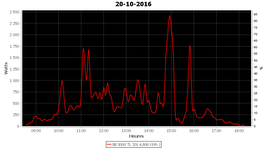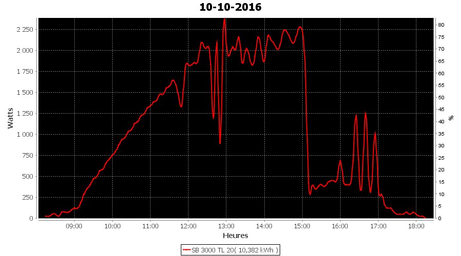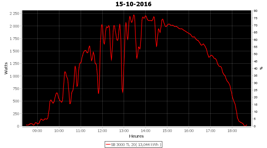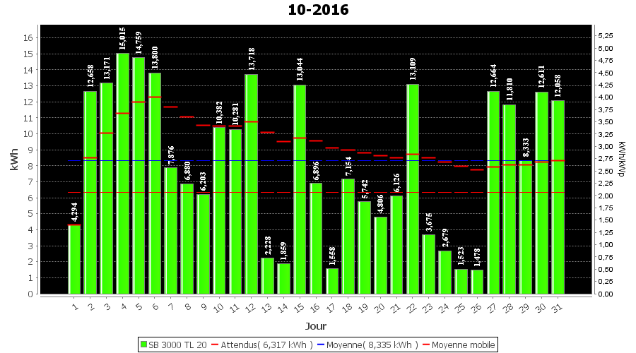 | Jour | | Production(kWh) | kWh/kWp | Co2 (Kg) | Gains | % |