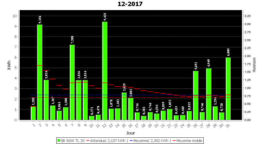 | Jour | | Production(kWh) | kWh/kWp | Co2 (Kg) | Gains | % |