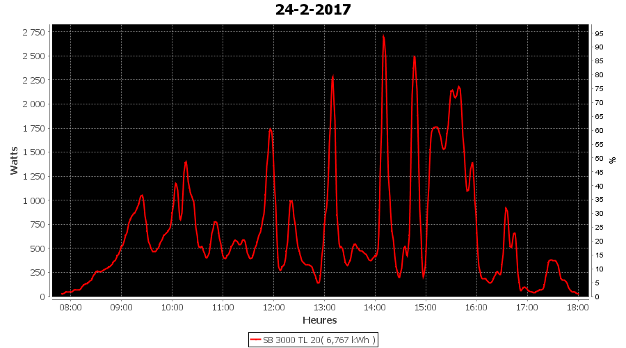 | Jour | | Production(kWh) | kWh/kWp | Co2 (Kg) | Gains | % |