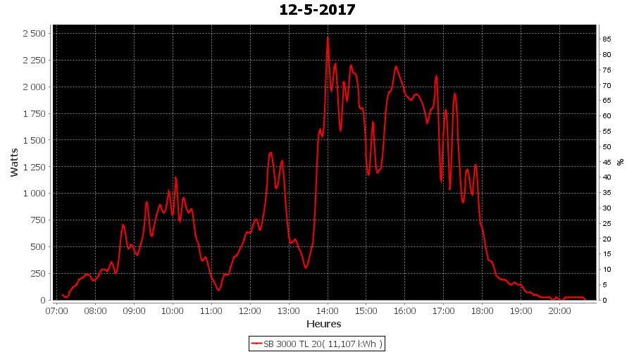 | Jour | | Production(kWh) | kWh/kWp | Co2 (Kg) | Gains | % |