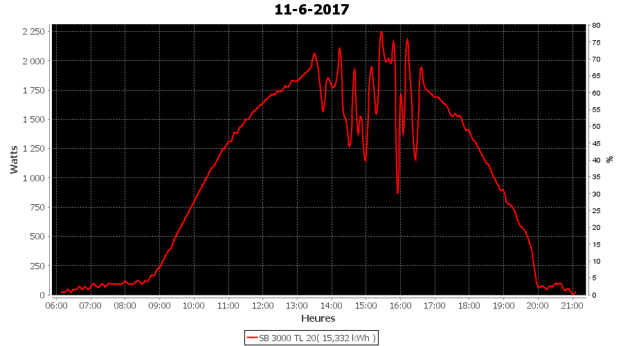 | Jour | | Production(kWh) | kWh/kWp | Co2 (Kg) | Gains | % |