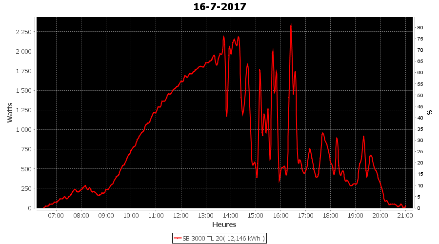 | Jour | | Production(kWh) | kWh/kWp | Co2 (Kg) | Gains | % |
