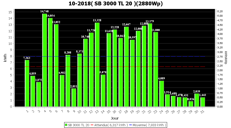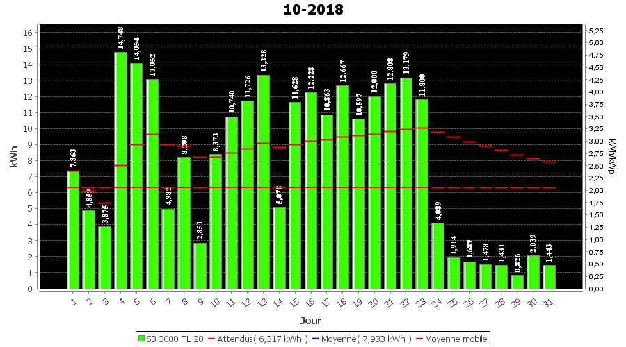 | Jour | | Production(kWh) | kWh/kWp | Co2 (Kg) | Gains | % |