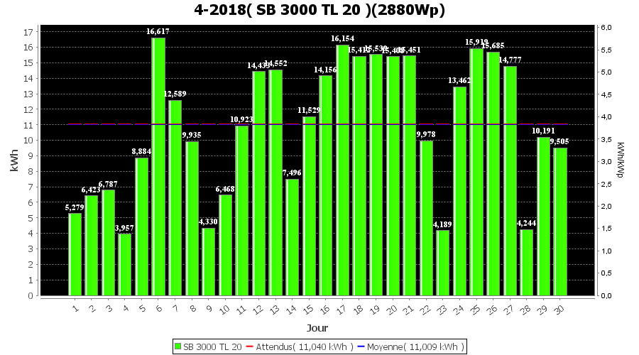 | Jour | | Production(kWh) | kWh/kWp | Co2 (Kg) | Gains | % |