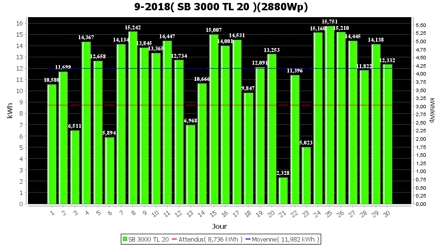 | Jour | | Production(kWh) | kWh/kWp | Co2 (Kg) | Gains | % |
