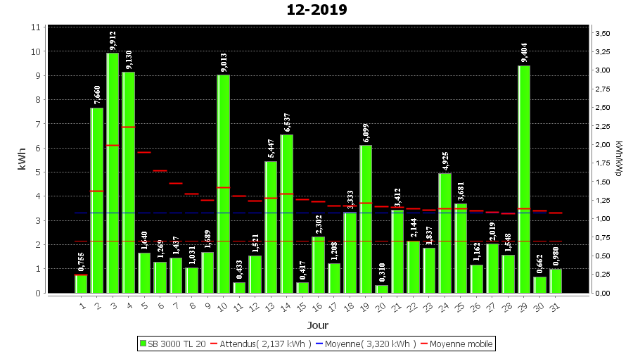 | Jour | | Production(kWh) | kWh/kWp | Co2 (Kg) | Gains | % |