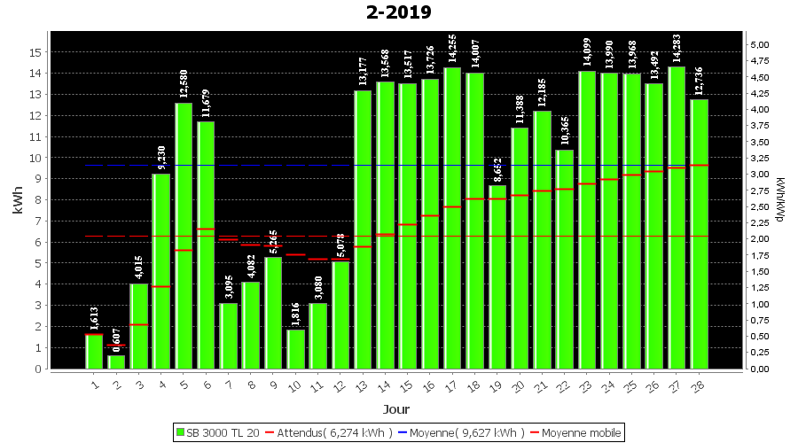 | Jour | | Production(kWh) | kWh/kWp | Co2 (Kg) | Gains | % |