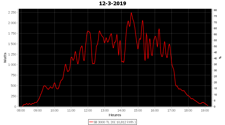 | Jour | | Production(kWh) | kWh/kWp | Co2 (Kg) | Gains | % |
