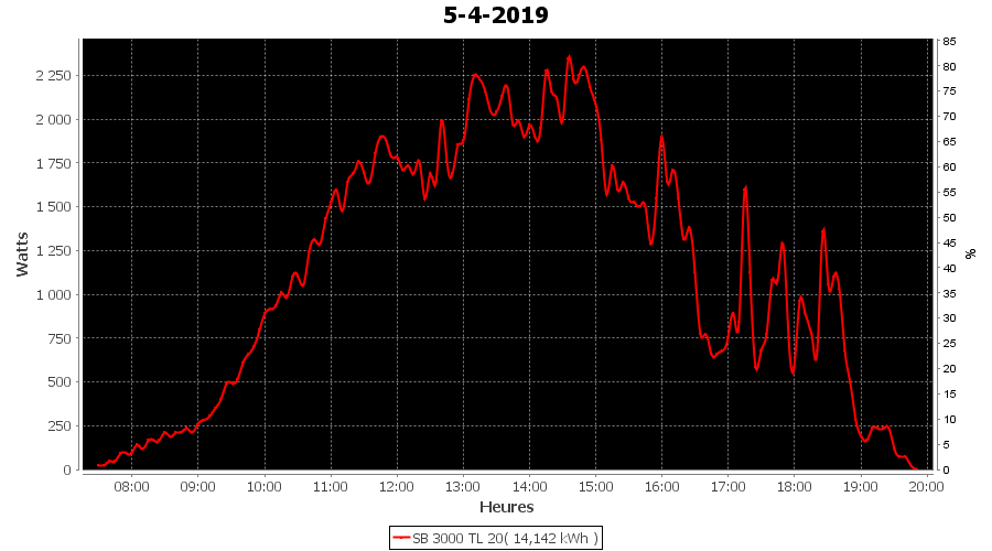 | Jour | | Production(kWh) | kWh/kWp | Co2 (Kg) | Gains | % |