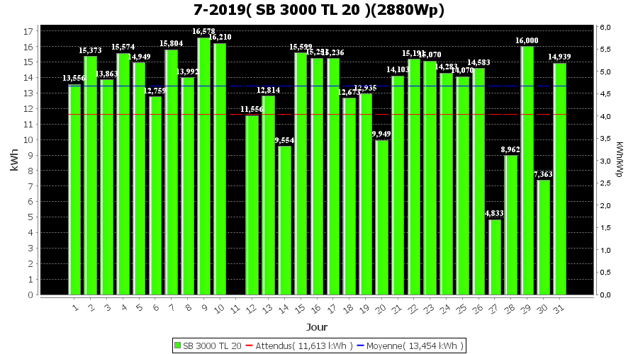 | Jour | | Production(kWh) | kWh/kWp | Co2 (Kg) | Gains | % |