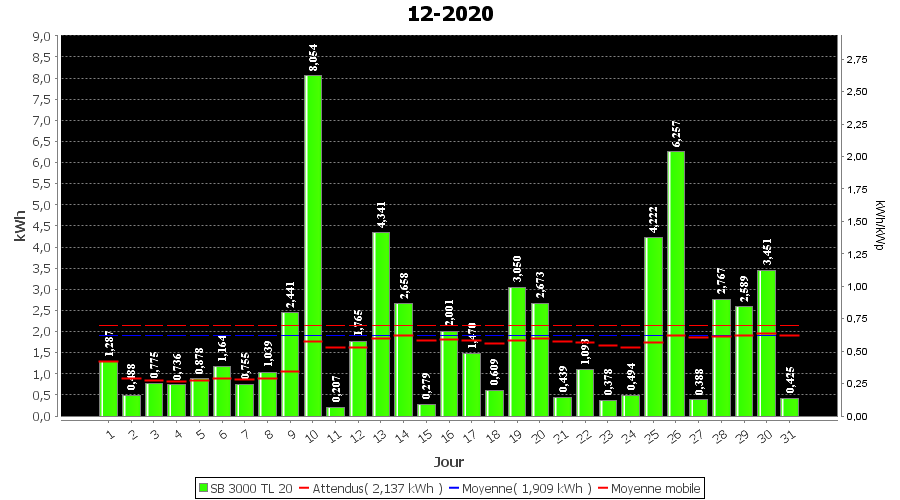 | Jour | | Production(kWh) | kWh/kWp | Co2 (Kg) | Gains | % |