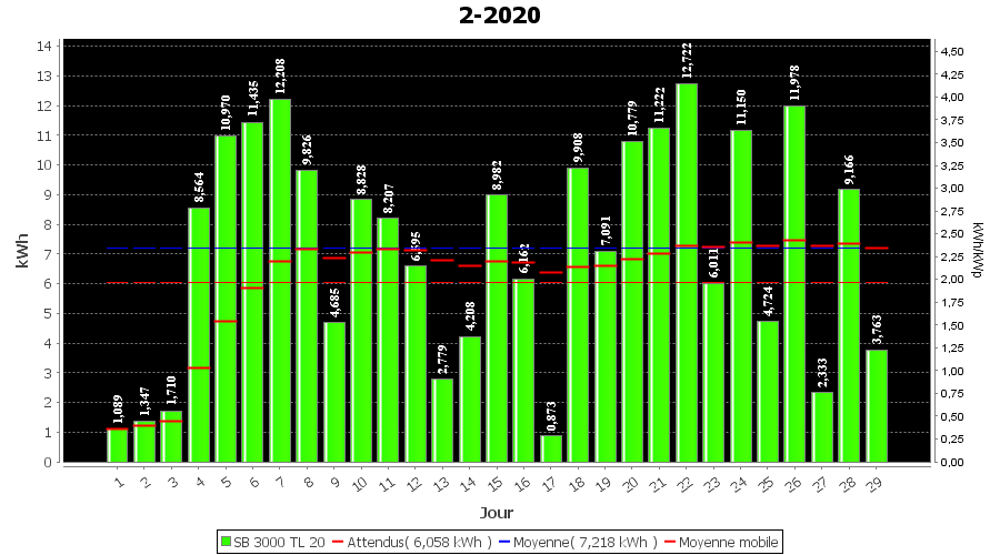 | Jour | | Production(kWh) | kWh/kWp | Co2 (Kg) | Gains | % |
