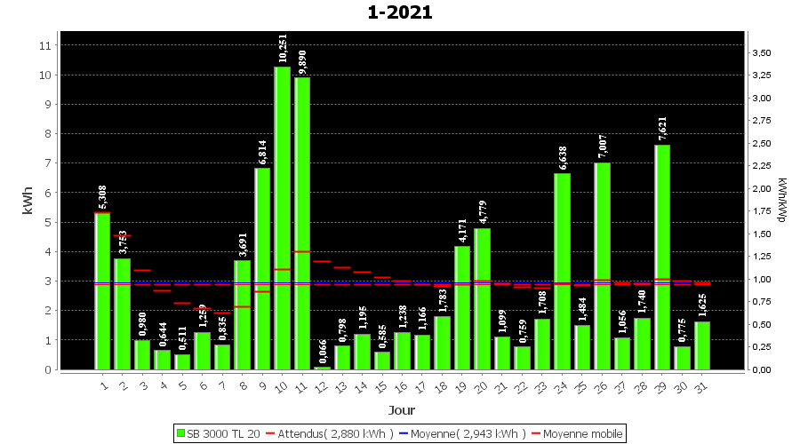 | Jour | | Production(kWh) | kWh/kWp | Co2 (Kg) | Gains | % |