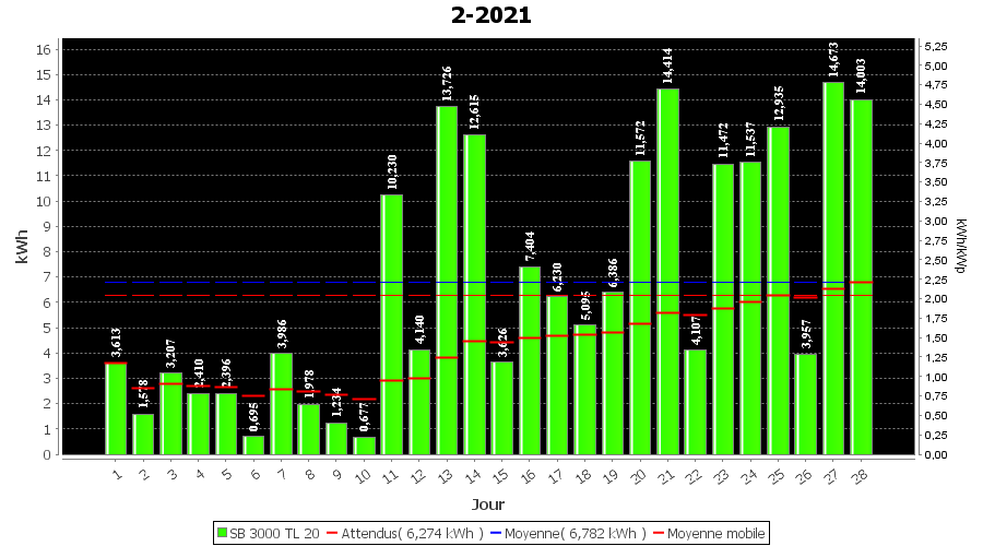 | Jour | | Production(kWh) | kWh/kWp | Co2 (Kg) | Gains | % |