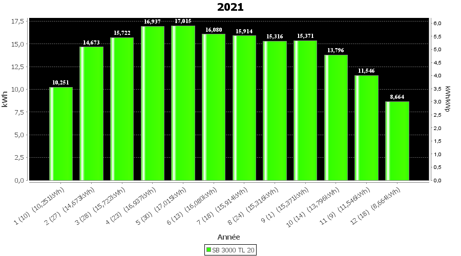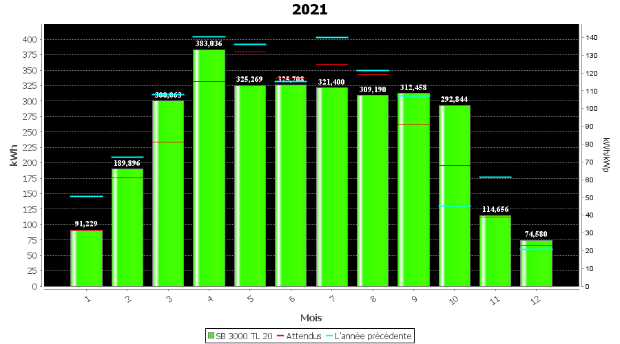 | Mois | Production(kWh) | kWh/kWp | Co2 (Kg) | Gains | % |