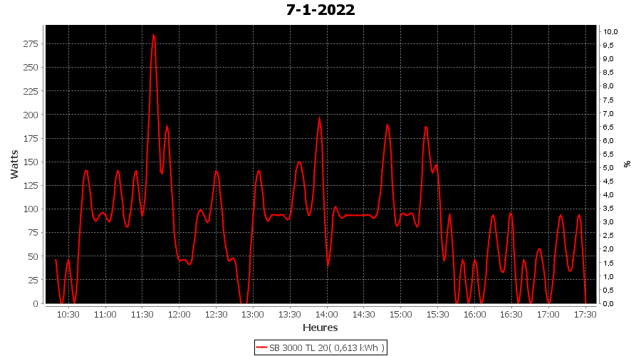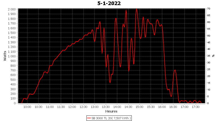 | Jour | | Production(kWh) | kWh/kWp | Co2 (Kg) | Gains | % |
