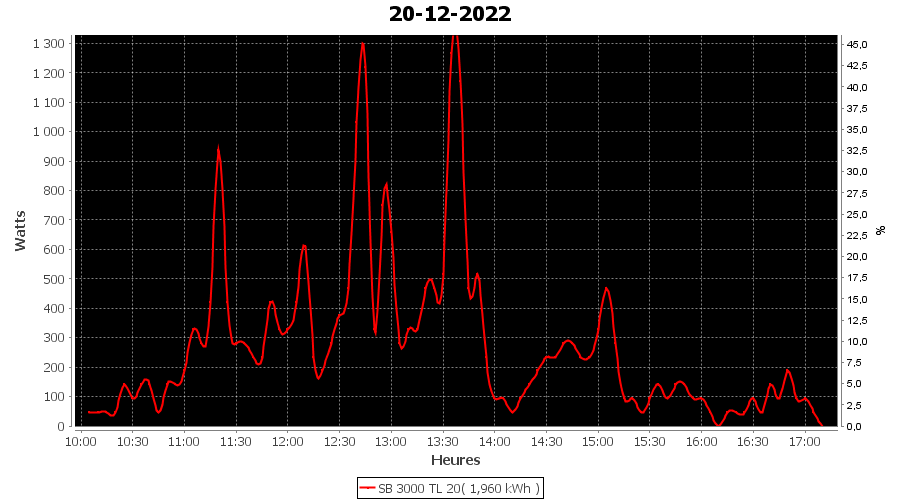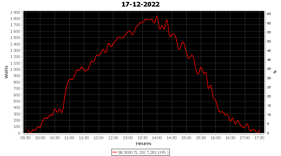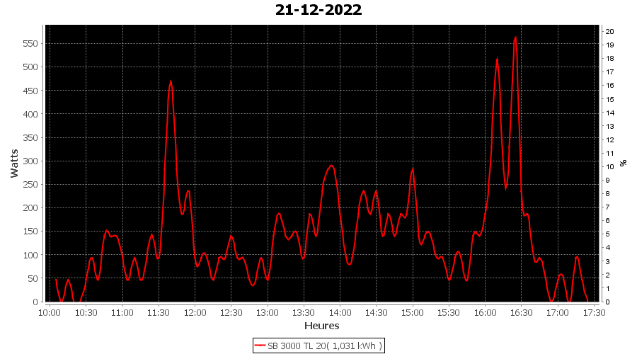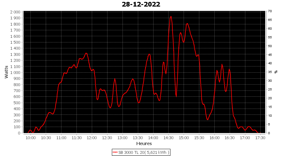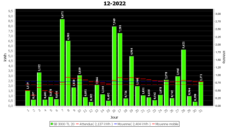 | Jour | | Production(kWh) | kWh/kWp | Co2 (Kg) | Gains | % |