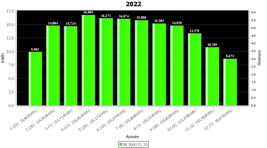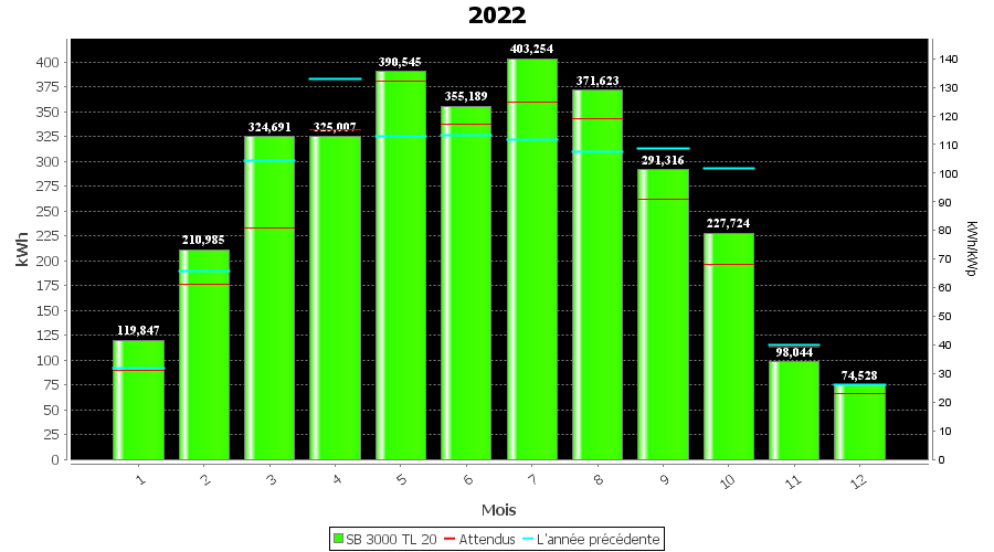 | Mois | Production(kWh) | kWh/kWp | Co2 (Kg) | Gains | % |