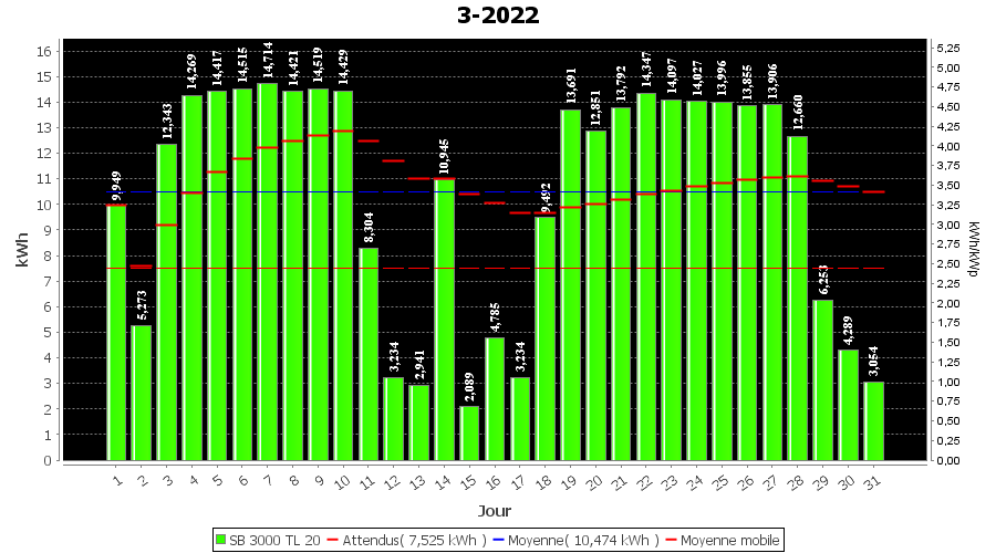 | Jour | | Production(kWh) | kWh/kWp | Co2 (Kg) | Gains | % |