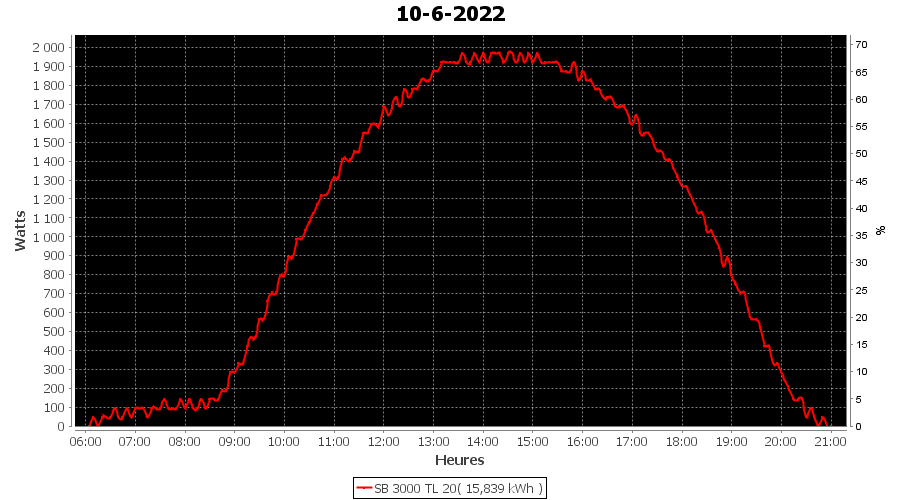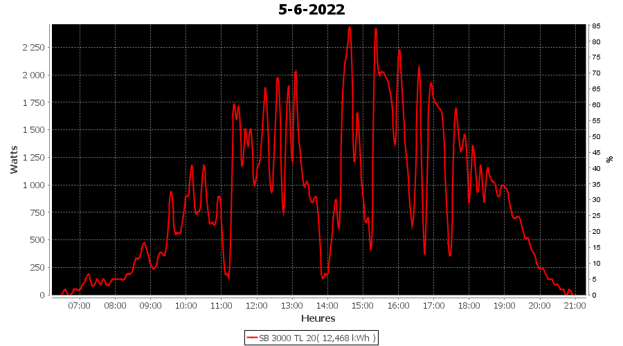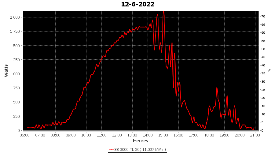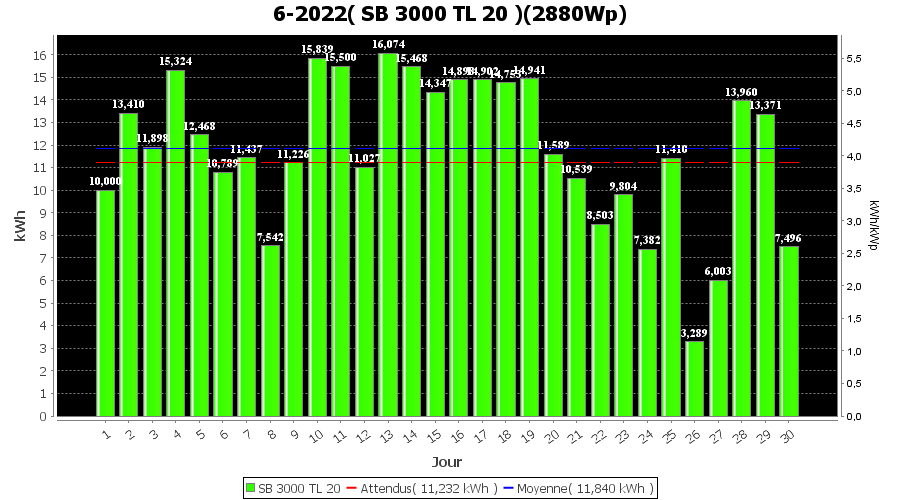 | Jour | | Production(kWh) | kWh/kWp | Co2 (Kg) | Gains | % |