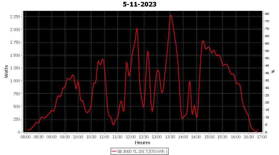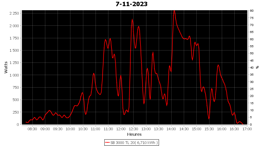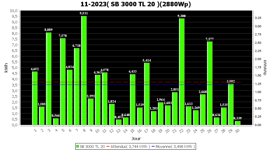| Jour | | Production(kWh) | kWh/kWp | Co2 (Kg) | Gains | % |