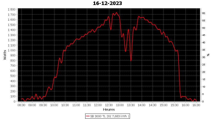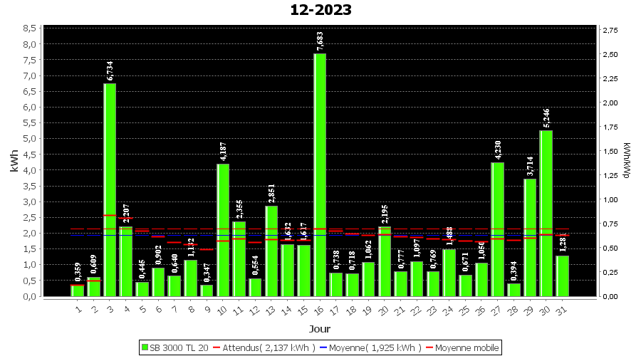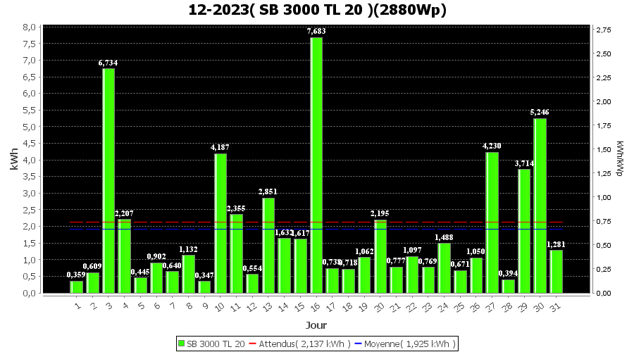| Jour | | Production(kWh) | kWh/kWp | Co2 (Kg) | Gains | % |