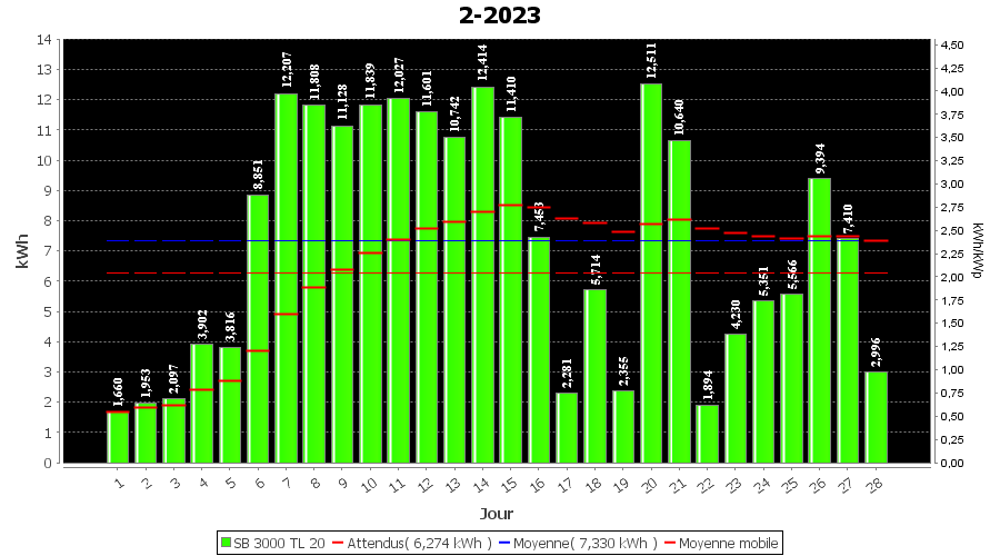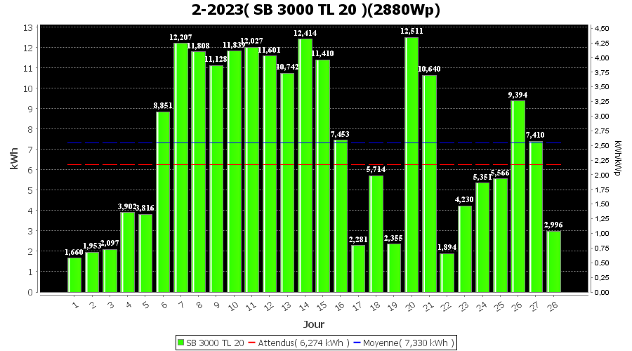 | Jour | | Production(kWh) | kWh/kWp | Co2 (Kg) | Gains | % |