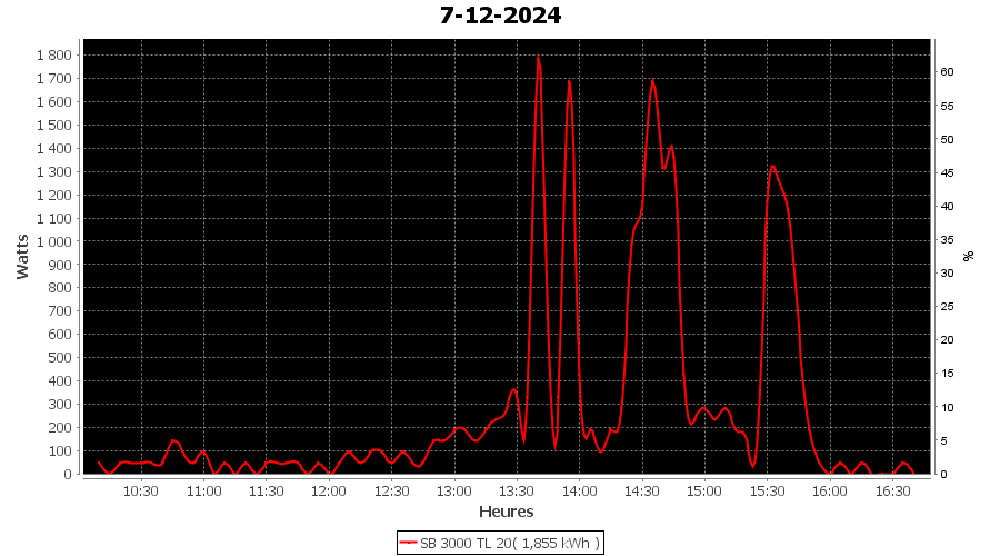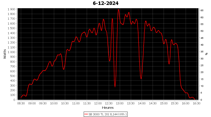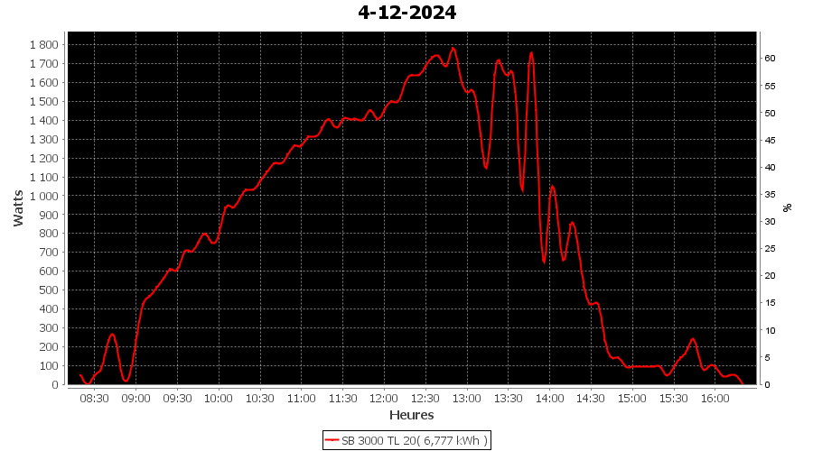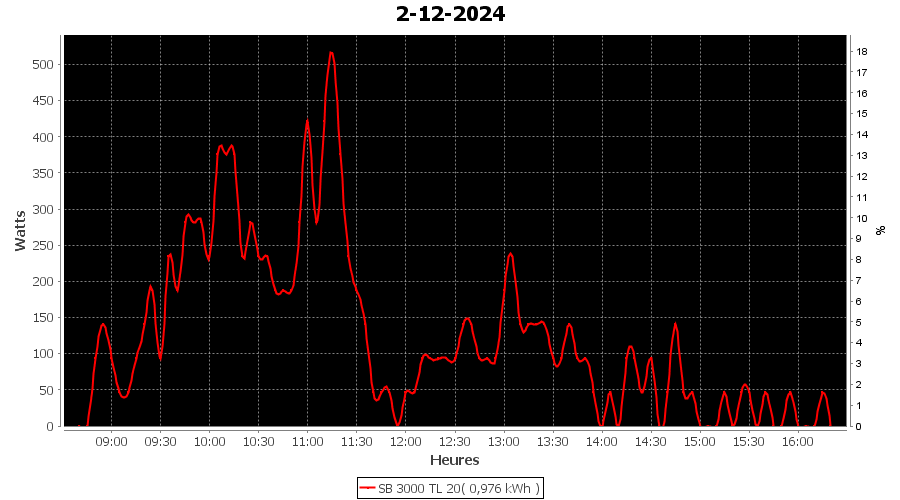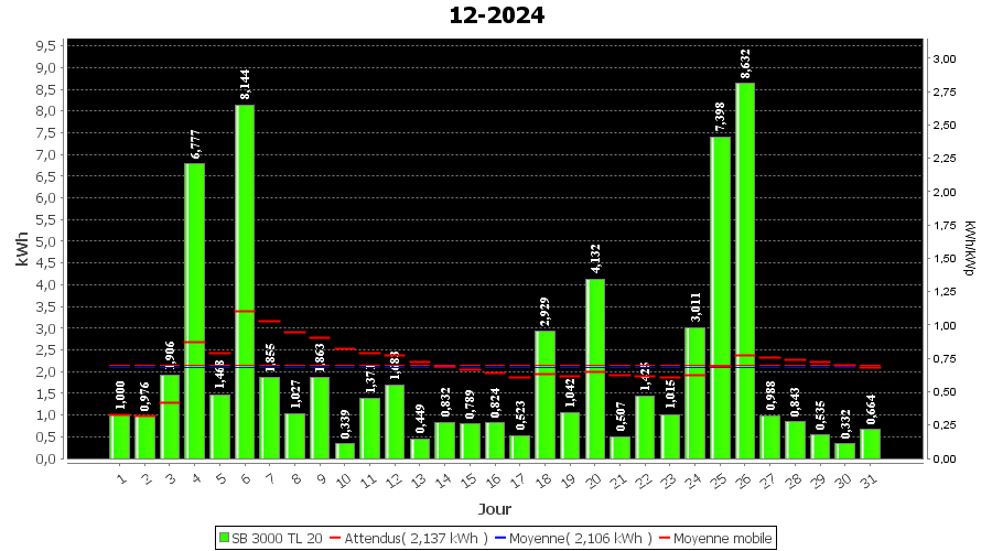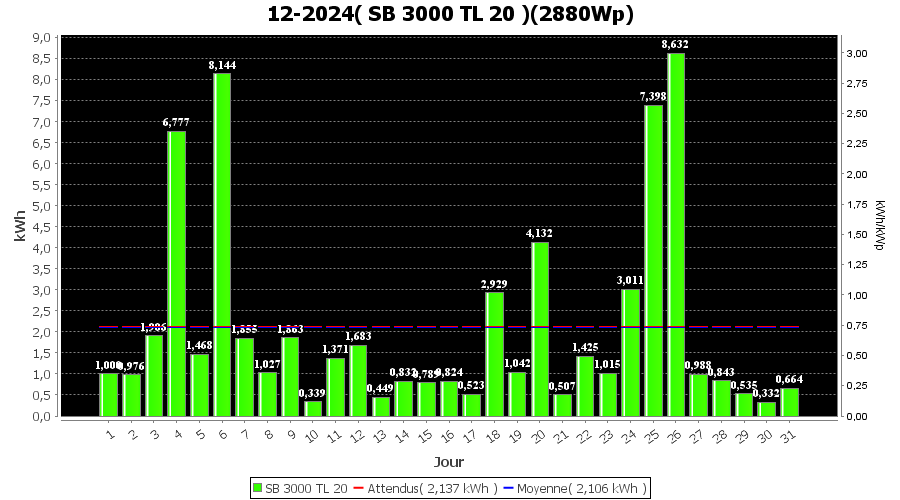 | Jour | | Production(kWh) | kWh/kWp | Co2 (Kg) | Gains | % |