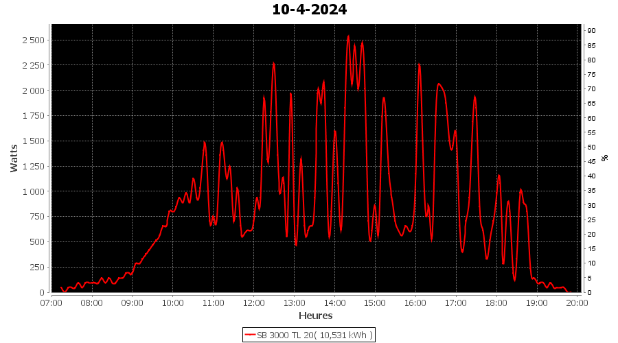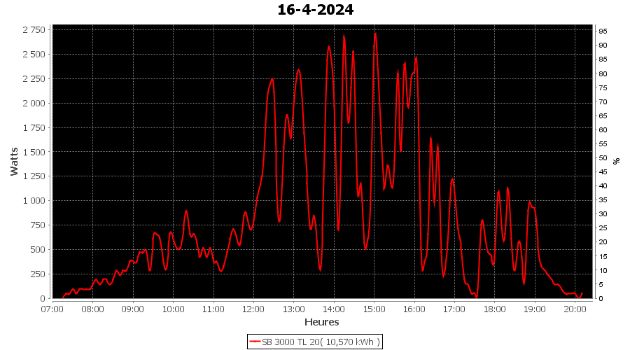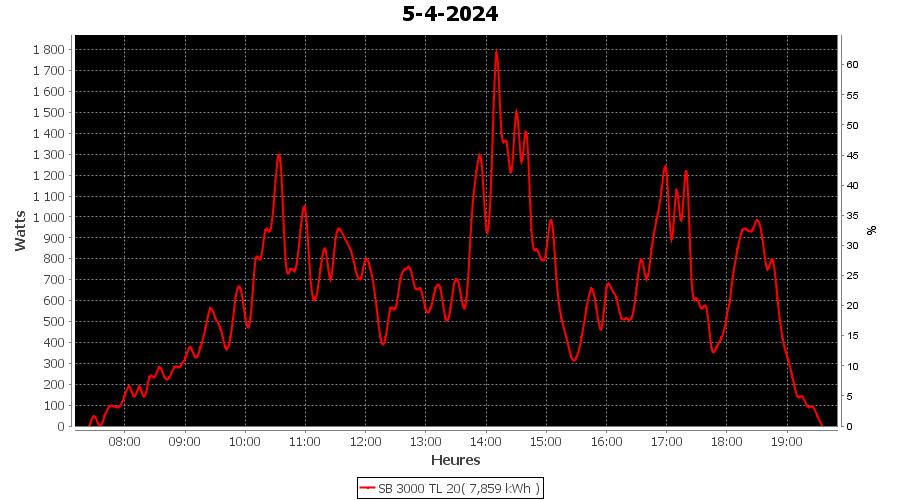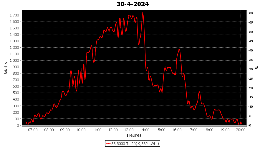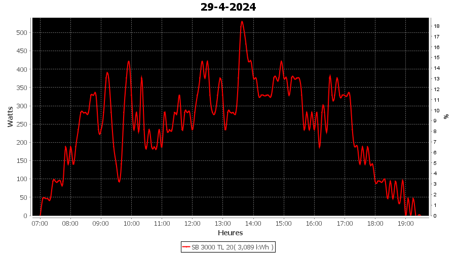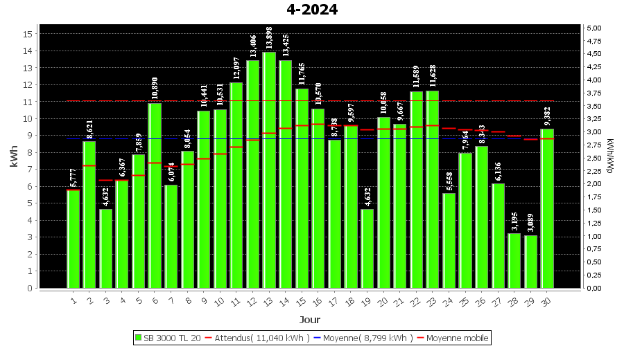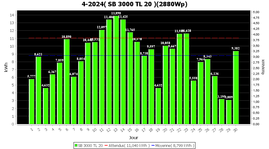 | Jour | | Production(kWh) | kWh/kWp | Co2 (Kg) | Gains | % |