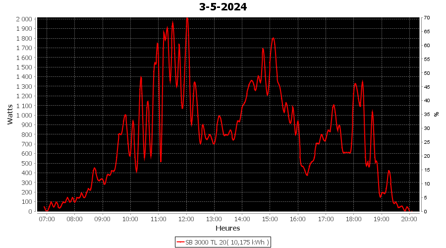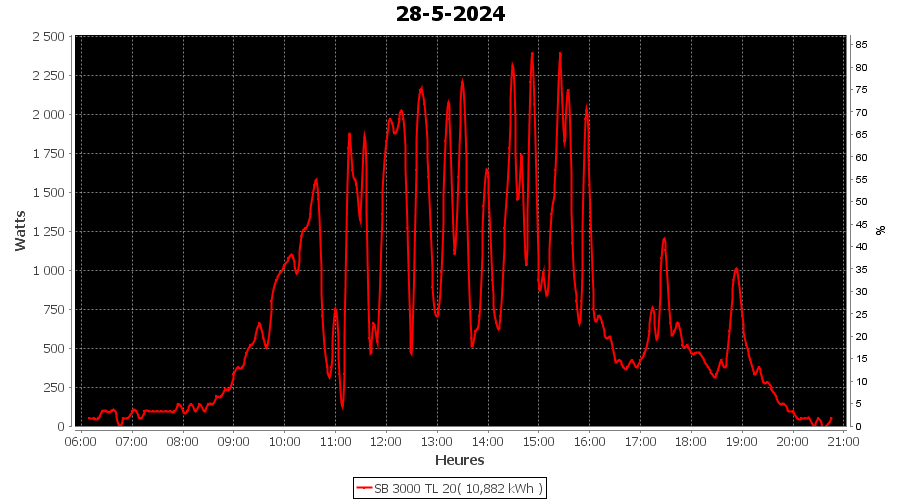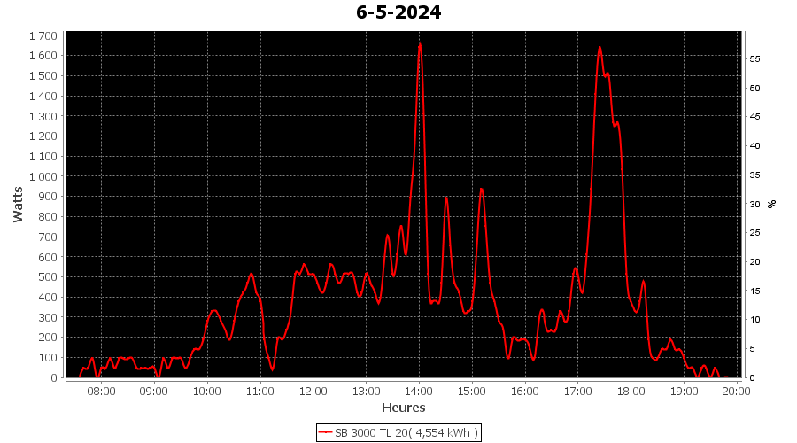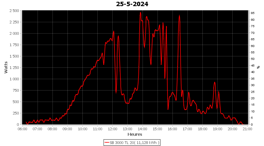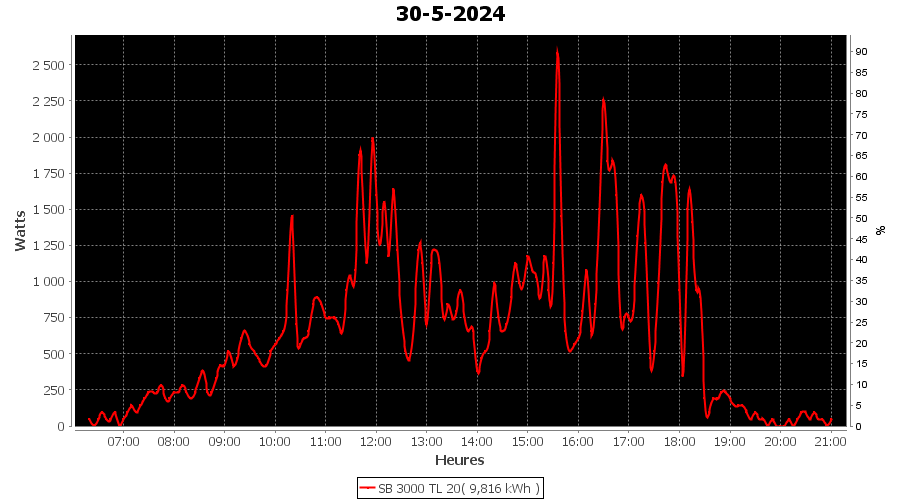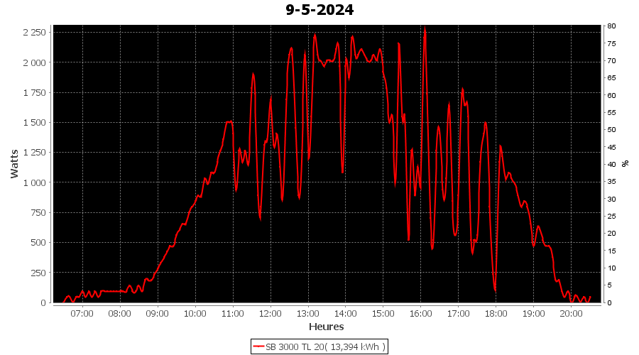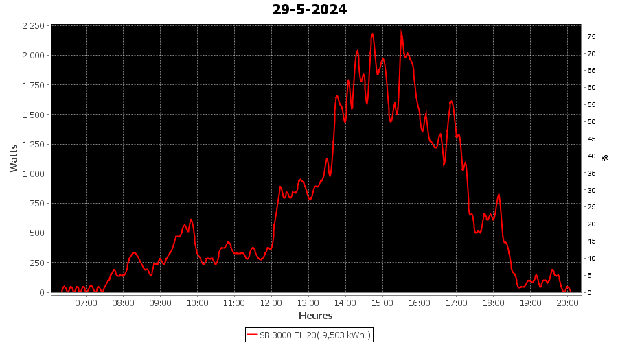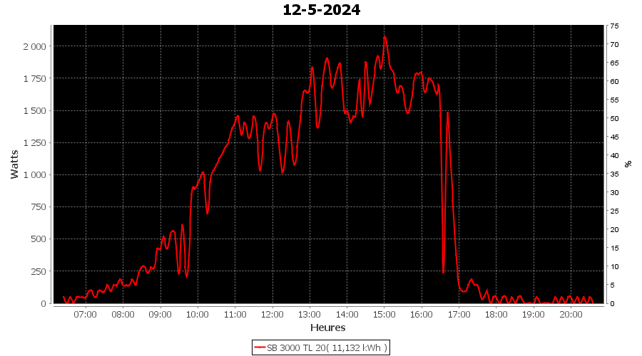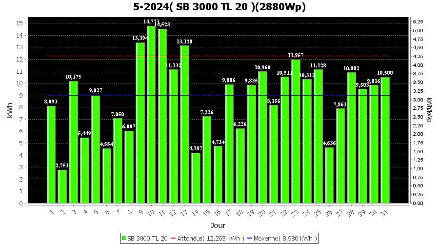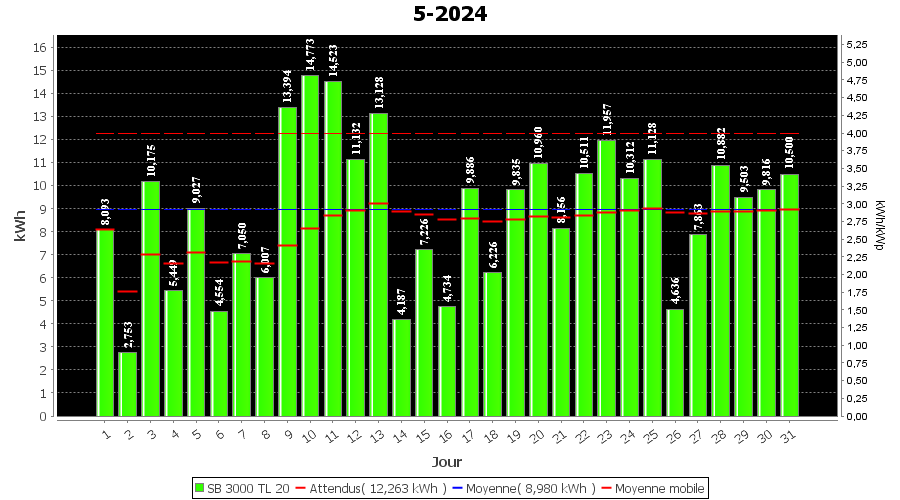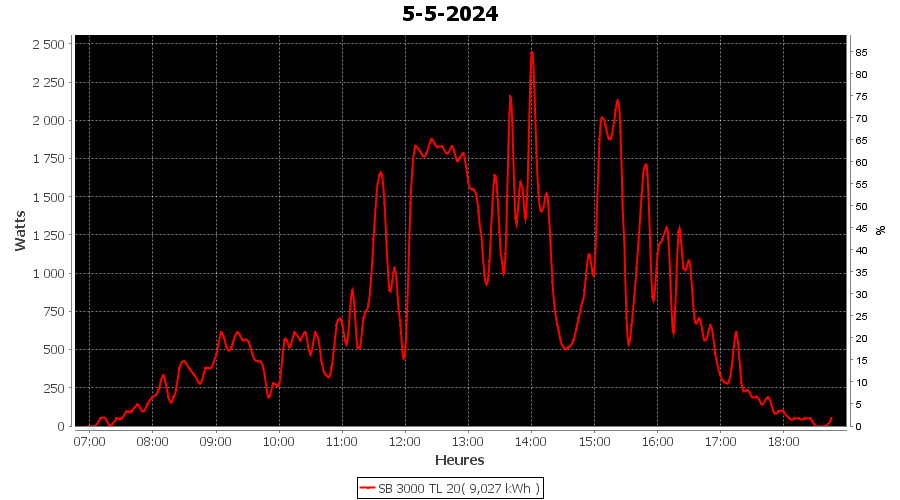 | Jour | | Production(kWh) | kWh/kWp | Co2 (Kg) | Gains | % |
