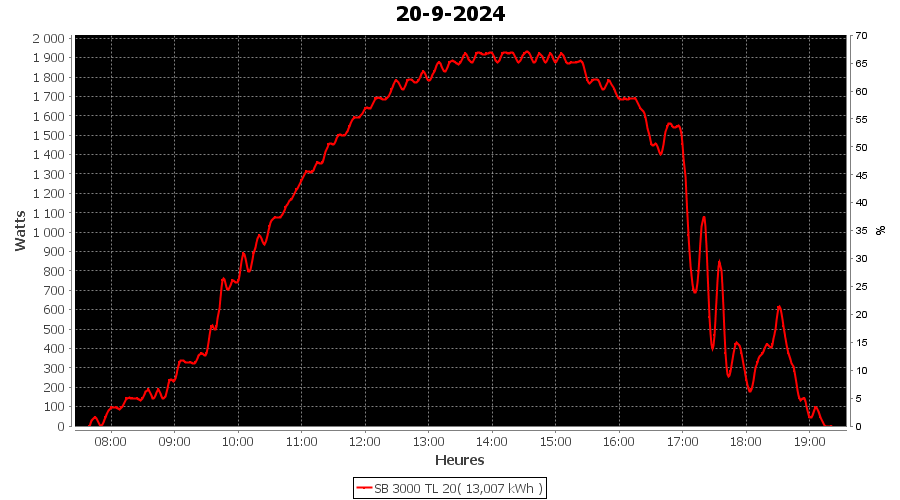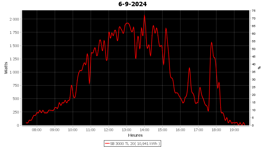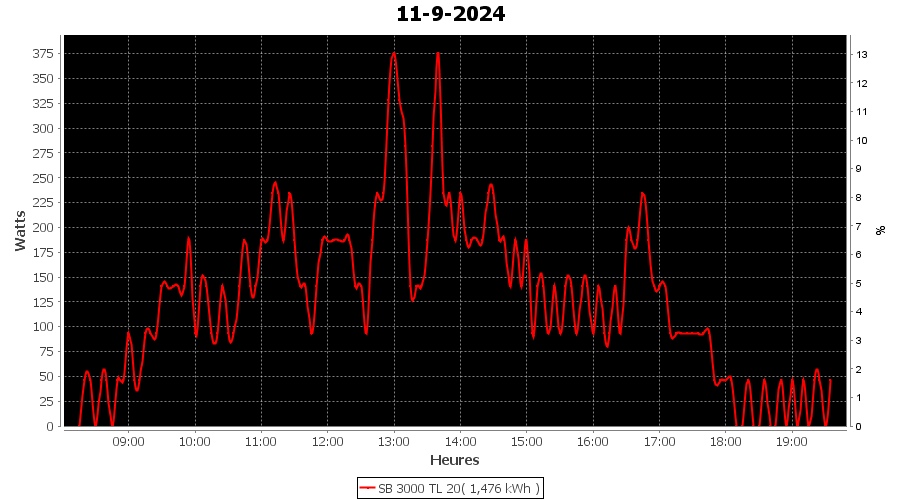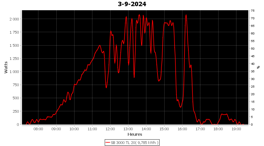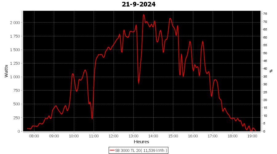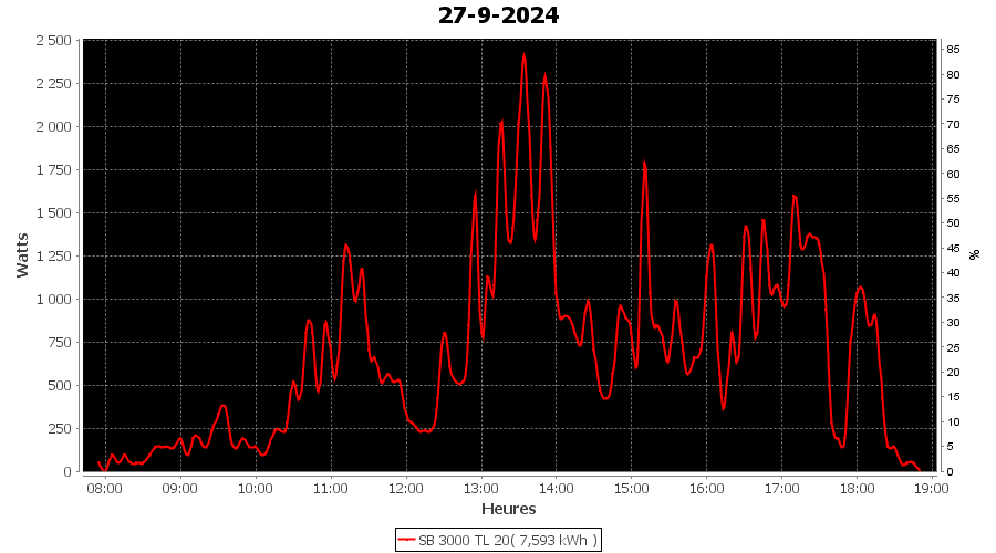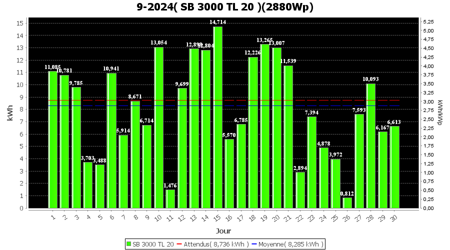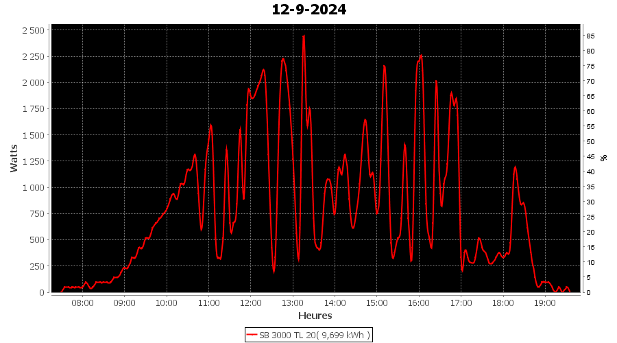 | Jour | | Production(kWh) | kWh/kWp | Co2 (Kg) | Gains | % |