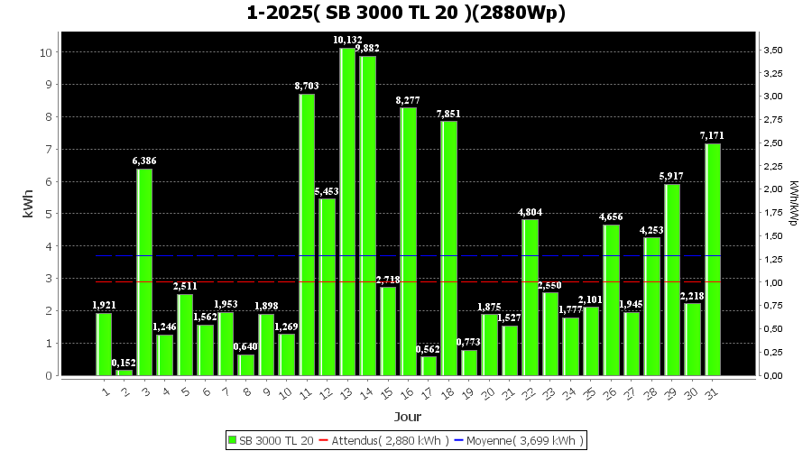 | Jour | | Production(kWh) | kWh/kWp | Co2 (Kg) | Gains | % |