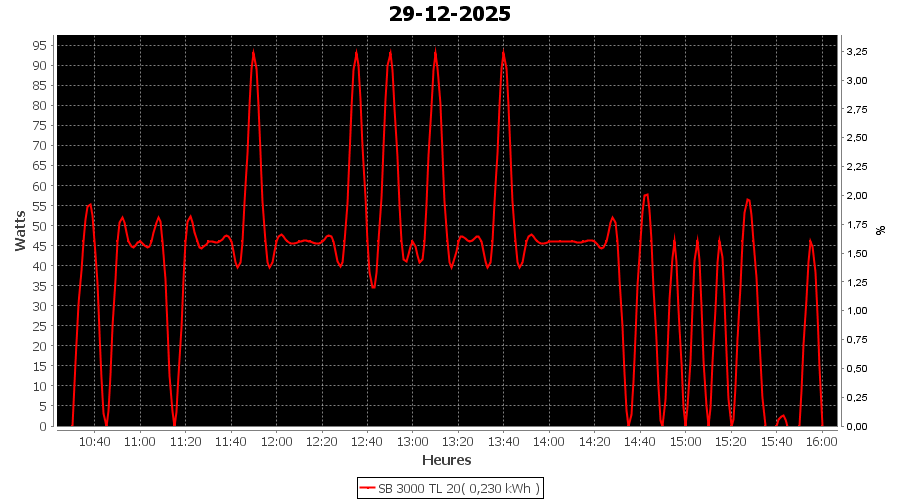 | Jour | | Production(kWh) | kWh/kWp | Co2 (Kg) | Gains | % |