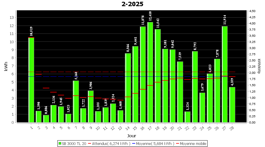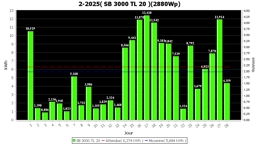 | Jour | | Production(kWh) | kWh/kWp | Co2 (Kg) | Gains | % |