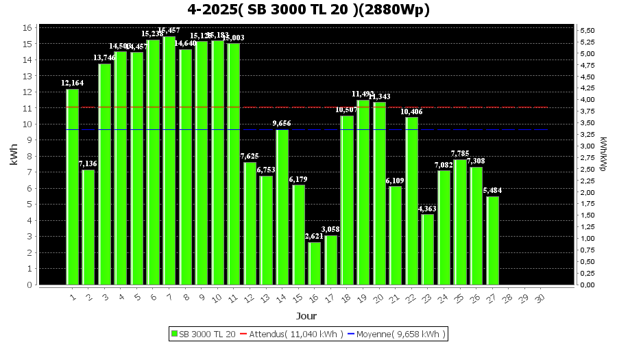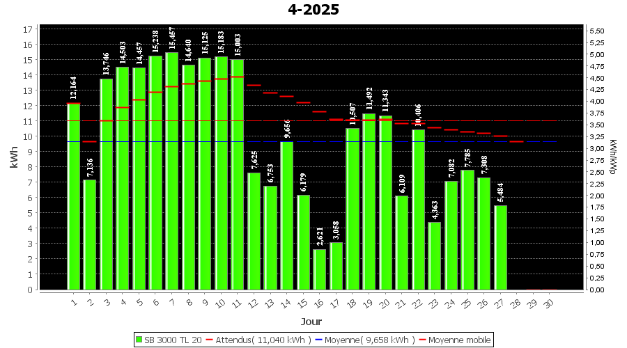 | Jour | | Production(kWh) | kWh/kWp | Co2 (Kg) | Gains | % |