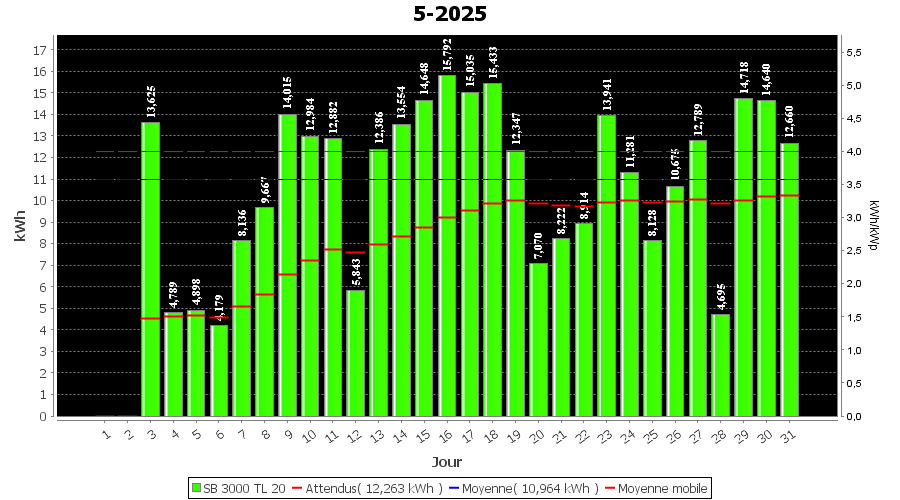 | Jour | | Production(kWh) | kWh/kWp | Co2 (Kg) | Gains | % |